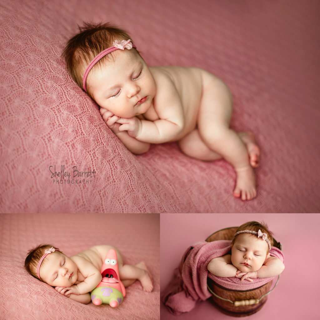 Sometimes parents bring in sentimental items for me to utilize with their newborn session in my Pace, Florida Newborn Photography studio. I try to incorporate them in a nice way while still giving a nod to their special object. In this case, dad really wanted to show tribute to his Patrick toy – something to do with his Podcast, I think. I must admit that it is probably the most surprising item I have been asked to incorporate, but we made it work!